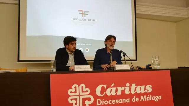 La presentación del informe FOESSA en Málaga, a cargo del director de Cáritas Diocesana de Málaga, José Miguel Santos, y del miembro del coordinador del estudio, Daniel Rodríguez de Blas. / L. O.