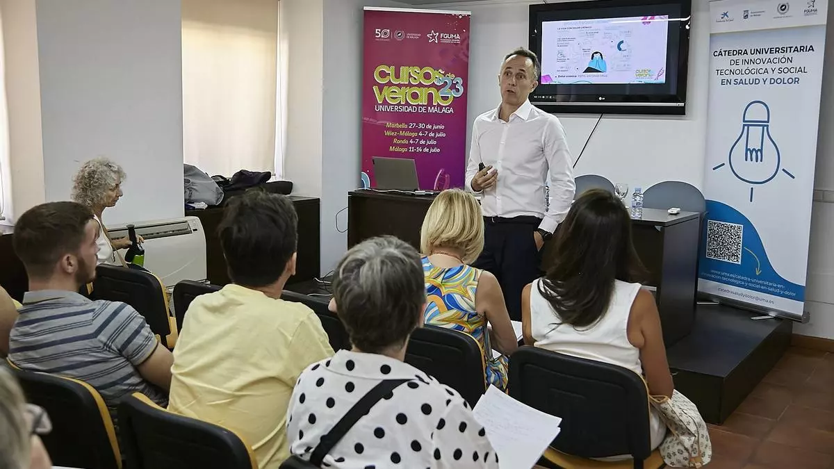 La cita, que se enmarca en los Cursos de Verano de la UMA, dejó consideraciones de este experto, tales y como que «vivir con dolor es una experiencia que va más allá de lo puramente biológico, no ponemos el acento en las emociones que vienen asociadas a él, ni en cómo afecta a la vida diaria de los pacientes», aludiendo al impacto que tiene en la esfera social.